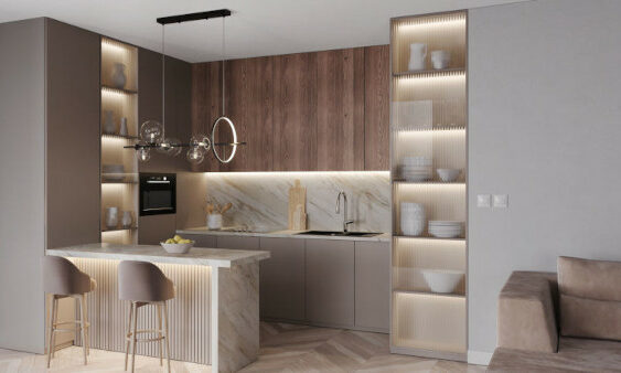 Stonowana paleta barw, oparta na beżach, brązach i ciepłych szarościach kreuje spokojny klimat. Fronty pozbawione uchwytów tworzą jednolitą płaszczyznę, a połączenie matowych powierzchni z naturalnym rysunkiem drewna na górnych szafkach ociepla wystrój i nadaje mu szlachetność. Przeszklone, podświetlane witryny z pionowym ryflowaniem eksponują ceramikę, pełniąc przy tym dekoracyjną funkcję. Stanowisko zmywania naczyń zostało ulokowane przy ścianie, gdzie głównym elementem jest marmurowy pas ciągnący się przez blat, backsplash powtórzony także na wyspie. Uwagę przykuwa jednouchwytowa bateria CUMULUS marki FERRO w chromowanym wykończeniu, której forma wpisuje się w minimalistyczny styl wnętrza. Jej wyciągana, 2-funkcyjna wylewka umożliwia swobodne mycie nawet nieporęcznych naczyń. Uzupełnia ją półtorakomorowy zlewozmywak MEZZO II o strukturze z granitu gwarantującej trwałość i odporność na uszkodzenia.