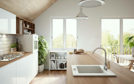 Drewno o ciepłej tonacji obecne na podłodze, skośnym suficie i blatach przełamuje chłód białych powierzchni i nadaje przytulność. Wyspa robocza z jednokomorowym zlewem, uzupełniona jest baterią ALGEO z łukową, obrotową wylewką i wygodnym, płaskim uchwytem. Jej chromowane wykończenie kontrastuje z matowym blatem. Przemyślany układ otwartych półek i regałów jest lekki i funkcjonalny. Rośliny doniczkowe oraz widok za oknami potęgują wrażenie kontaktu z naturą.