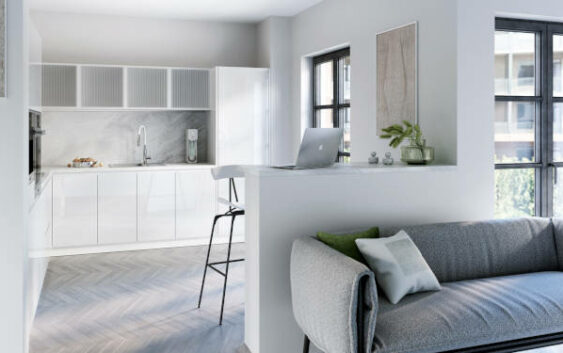 Jasny, minimalistyczny aneks kuchenny oddzielony jest od salonu blatem pełniącym funkcję stołu śniadaniowego lub miejsca do pracy. Jest to praktyczne rozwiązanie, które pozwala na wielofunkcyjne wykorzystanie przestrzeni. Białe, gładkie fronty szafek bez widocznych uchwytów podkreślają nowoczesny charakter wnętrza. Bateria ZUMBA SLIM 2F marki FERRO stoi przy szarym, jednokomorowym zlewozmywaku MEZZO II. Wyposażona jest w praktyczną, giętką wylewkę, regulator ceramiczny oraz dwie funkcje strumienia. Biel wylewki podkreślona jest błyszczącym chromowanym wykończeniem pozostałych części. Wysokie, czarne krzesło barowe kontrastuje z jasną kolorystyką, a obraz na ścianie utrzymany jest w neutralnych tonach, co nie odwraca uwagi od głównych elementów.