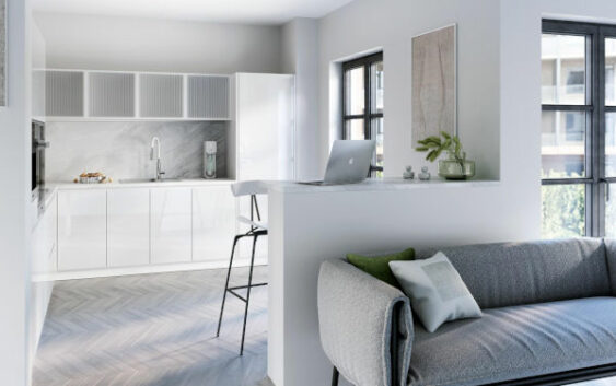 Gładkie fronty zabudowy odbijają promienie wpadające przez drzwi tarasowe, optycznie powiększając i rozjaśniając wnętrze. Niski fragment ściany intuicyjnie oddziela część wypoczynkową od kuchennej, nie zasłaniając widoku. Dzięki blatowi i hokerom pełni również funkcję stołu jadalnianego oraz miejsca do pracy. Pod szafkami z ornamentowym szkłem zaaranżowano strefę zmywania z szarym,  jednokomorowym zlewozmywakiem z ociekaczem MEZZO II i innowacyjną baterią ZUMBA SLIM 2F marki FERRO, wyposażoną w elastyczną białą wylewkę, dwie funkcje strumienia i chromowane detale. Jasne barwy w odcieniach bieli i szarości ożywia zieleń w szklanym naczyniu i poduszka na kanapie w tym samym kolorze.